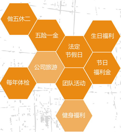 做五休二+五险一金+法定节假日+带薪年假+每年的体检+不定期的团队活动+生日福利+节假日福利金+健身福利等等!